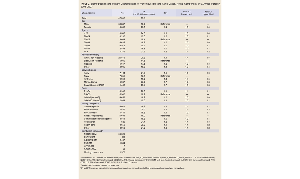 There are limitations to this update that should be considered when interpreting its findings. Although heat illnesses were summarized by the location of diagnosis or report, medical care may not occur at the same location (i.e., installation) as the heat illness event, particularly if the case required a level of care not available locally. To account for locations with medical care redundancy, some installations were combined (e.g., MCB Camp Lejeune/Cherry Point, NC in Table 3); this merging of locations was most prevalent with Marine Corps and Navy locations. In addition, the personnel files from the Defense Manpower Data Center that were utilized to calculate population estimates for the active component as well as the demographic data presented in Table 1 were unavailable for October through December 2024; the duty statuses of all service members in September 2024 were assumed to be their duty statuses through the end of the calendar year. It is likely that some individuals in the U.S. Armed Forces both joined and left service during those months, and those movements are unaccounted for in the population estimates. Likewise, it is possible some time-varying demographics (e.g., rank) changed for individuals from October through December 2024 compared to September, and those shifts in categories are unaccounted for. In all instances, however, the effect on the rates shown throughout the report should be minimal due to the large population size.