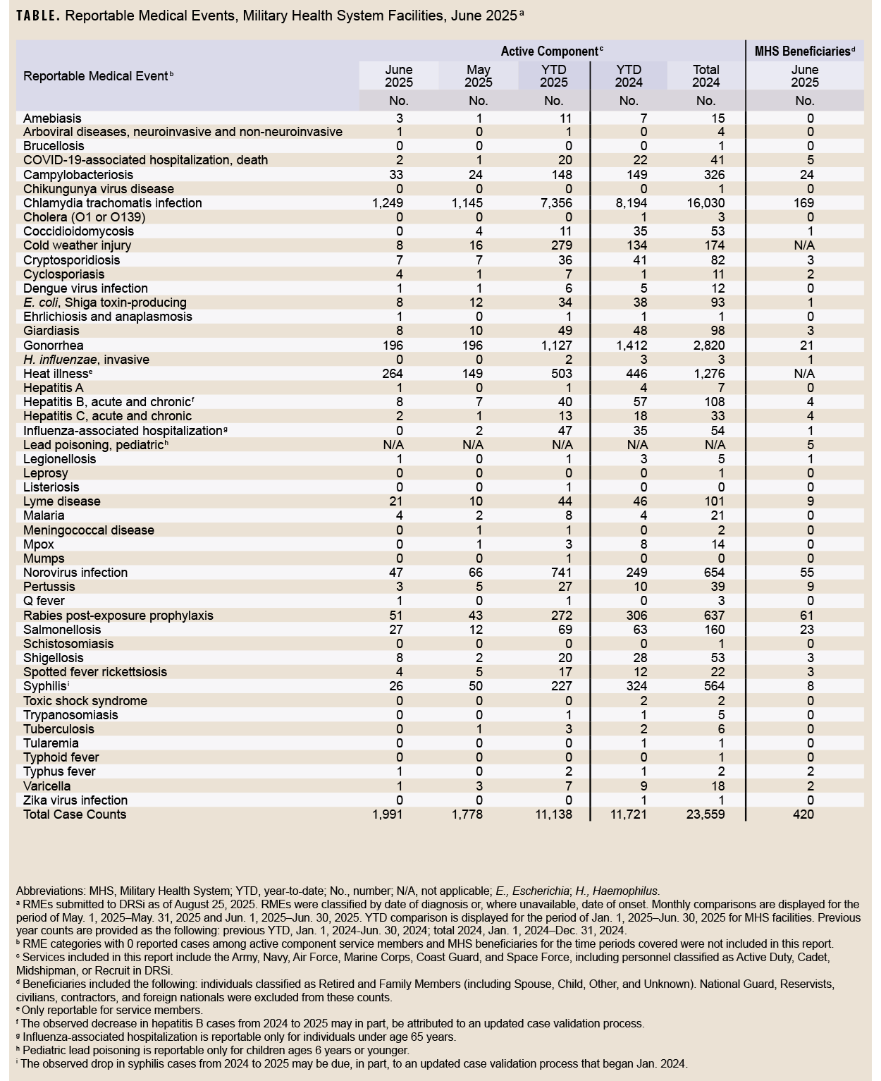 Reportable medical events at Military Health System facilities through week 27, ending June 30, 2025