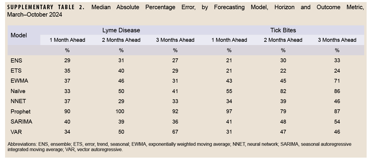 This study produced 2 major findings. First, among all the time series and machine-learning models mentioned in our analysis, 3 models—ENS, ETS, NNET—provided the most accurate forecasts of Lyme disease and tick bite activity in MHS beneficiaries, with increased accuracy during peak activity periods. This finding suggests that these 3 models would be valuable as early warning signals for public health surveillance and preparedness. It is important to note, however, that model accuracy decreased at longer horizons. Second, MAPE estimates were higher than those reported in previous studies using SARIMA models, although accuracy was improved by focusing on periods of higher activity. Individual surveillance regions aligned with the findings of the aforementioned study.6