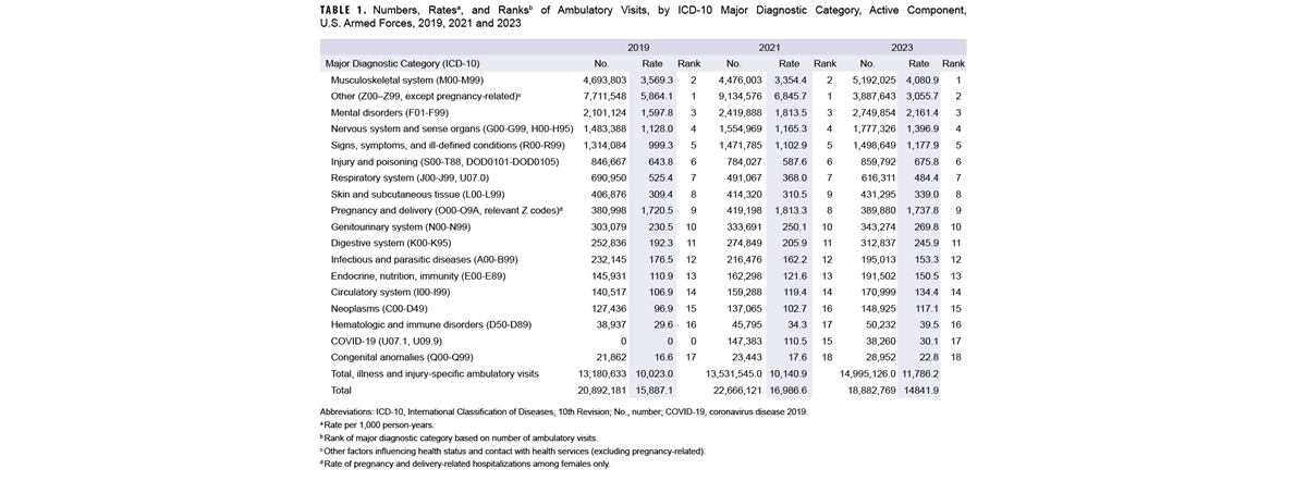 - Eick-Cost AA, Mabila SL, Ying S. HIV pre-exposure prophylaxis (PrEP) prescriptions within the active component of the U.S. military, 2023. MSMR. 2024;31(3):17. Accessed Apr. 16, 2025. https://www.health.mil/news/articles/2024/03/01/msmr-hiv-prep-prescription-snapshot