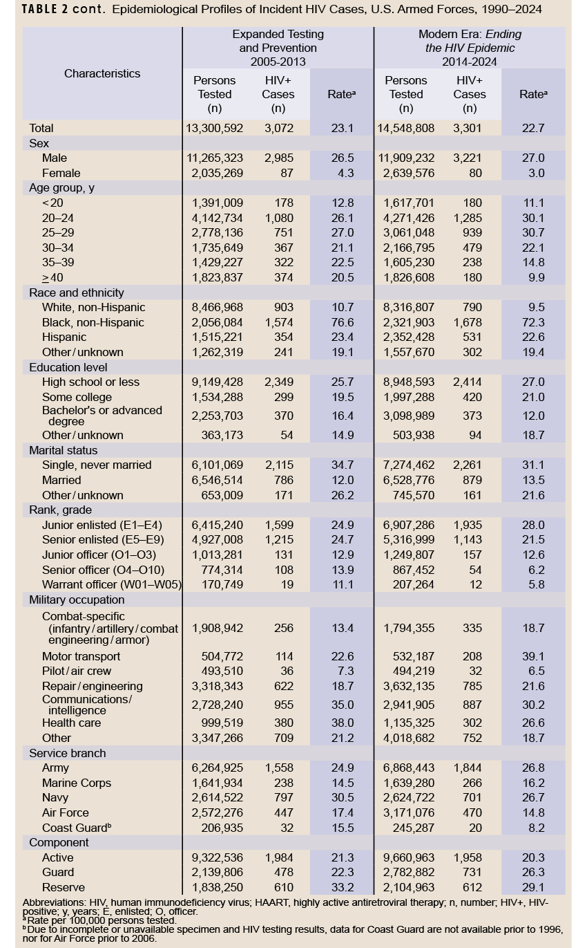 From 1990 through 2024, over 46 million tests for HIV antibodies were conducted among active, Guard, and reserve members of the U.S. Armed Forces, and 11,280 (24.3 per 100,000 persons tested) were diagnosed with HIV. Male service members comprised 96.3% of all HIV infections. The total rate of new HIV diagnoses declined over the period of surveillance, with the steepest decline in the first decade. Overall rates stabilized in 1997, but differences persist between different age and population groups. New HIV diagnoses have risen among male service members under age 30 years, with non-Hispanic Black service members bearing the highest burden and Hispanic service members experiencing the largest relative increases. Since 1997, rates in all racial and ethnic groups have more than doubled for those under age 25 years; for Hispanic service members, the increase was nearly 10-fold.