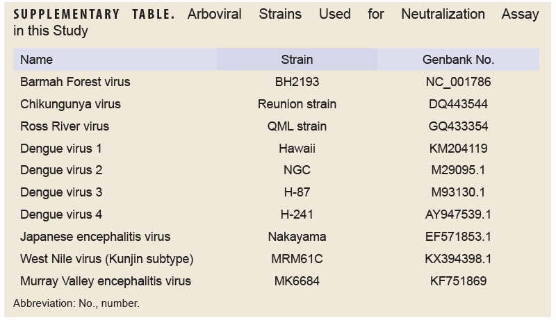 Vero cells (African green monkey kidney epithelial cells) and C6/36 mosquito cells were routinely cultured in the laboratory and used for micro-neutralization assays. The arboviral strains used for NAb assays in this study are listed in the Supplementary Table. The virus stock preparation and serum NAb titers were assessed using a micro-neutralization assay and modified according to methods previously described.6-8 NAb titer greater than or equal to 20 for flaviviruses and greater than or equal to 10 for alphaviruses were considered positive.