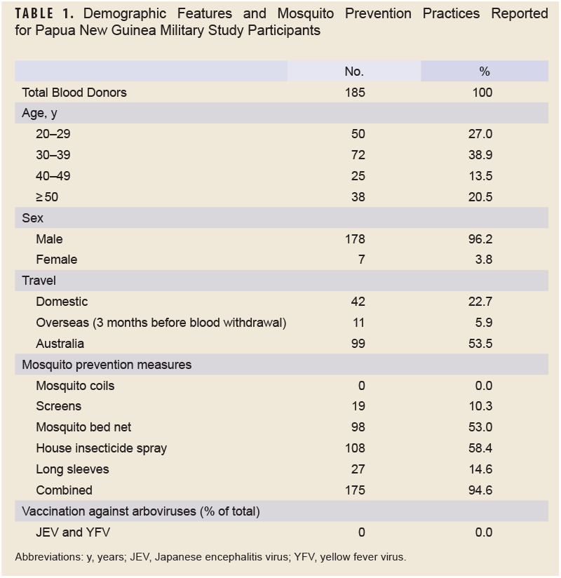 This study was part of an infectious disease surveillance program conducted by the ADF in conjunction with the Papua New Guinea Defence Force. A total of 185 PNGMP from Lae Barracks were recruited between April 20, 2023 and May 9, 2023. A convenience sample of serum specimens from PNGMP present at Lae Barracks during this period was collected. Participants provided written informed consent for additional infectious disease testing. Additional demographic and exposure data, including serum collection dates, age, sex, travel and vaccination history, and mosquito bite prevention measures, were self-reported via a study questionnaire. Due to security requirements, information on military occupational specialty, rank, and deployment history were not collected. The age range of participants was 24–60 years, with a median age of 35 years. The largest participant age group was 30-39 years (38.9%, n=72), followed by 20-29 years (27%, n=50). The cohort was predominantly male (96.2%, n=178). Forty-two participants reported domestic travel (22.7%), primarily to the capital, Port Moresby, or East or West Highlands regions. Ninety-nine participants (53.5%) reported travel history to Australia, but only 11 (5.9%) had traveled to Australia within 3 months prior to blood collection. All participants were asymptomatic at the time of blood withdrawal, with no reported history of prior infectious disease infections and outcomes, and no reported prior vaccination for JEV and YFV. Demographic features and mosquito prevention practices reported by survey respondents are summarized in Table 1.