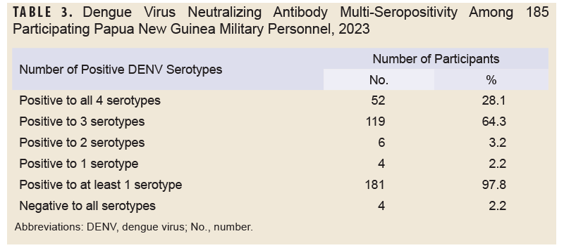 As shown in Table 3, nearly one-third (28.1%) of PNGMP in 2023 had pan-serotype immunity, or positivity to all 4 DENV serotypes. Moreover, 64.3% of participants were positive to three serotypes, suggesting multiple past infections or strong cross-reactive responses, likely due to co-circulation or sequential infections with different serotypes. Only a small fraction (5.4%) was positive to only 1 or 2 serotypes, and 2.2% were negative for all 4, indicating minimal or no prior DENV exposure in this subset.