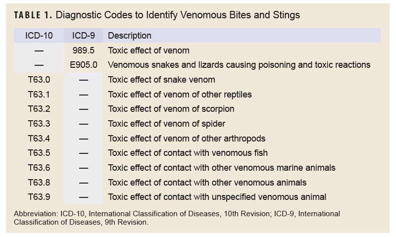 Another limitation to the study is the use of diagnostic codes that are prone to coding errors, as well as changes in ICD code changes form ICD-9 to ICD-10 that could lead to differences in incidence. ICD-9 coding for venomous bites and stings does not delineate encounters by type of animal, whereas ICD-10 codes provide details and stratification by animal type. As a result, data from October 2015 onwards provide a clear delineation of impacts by different types of bites and stings, making it easier to determine leading contributors to medical encounters among ACSMs.