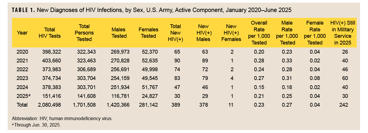 From January 2020 through June 2025, approximately 7 million U.S. military service members among the active component, reserve component, National Guard) were tested for antibodies to HIV, and 1,463 were identified as HIV-antibody-positive (seropositivity 0.21 per 1,000 tested). Of the 1,463 new infections identified during this period, only 40 (2.7%) were among female service members.