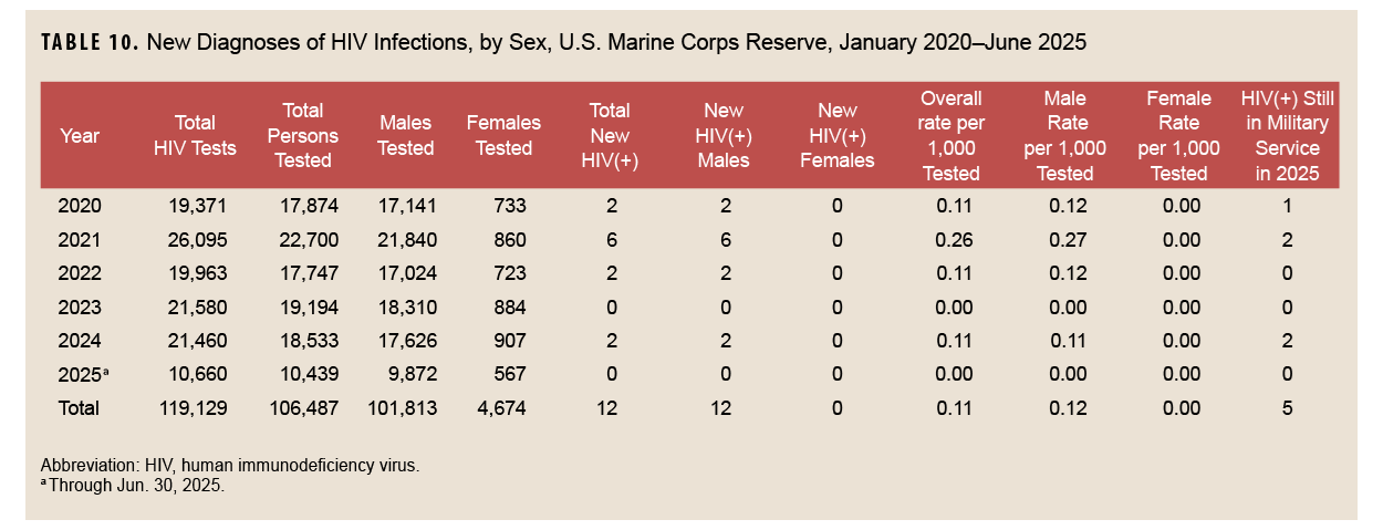 From January 2024 through June 2025, a total of 28,972 Marine Corps Reserve members were tested for antibodies to HIV, and 2 reservists were identified as HIV-antibody-positive (seropositivity 0.07 per 1,000 tested) (Table 10). During 2024, on average, 1 new HIV infection was detected among Marine Corps reservists per 10,730 screening tests. Of the 12 active component marine reservists diagnosed since 2020 with HIV infection, 5 (41.7%) were still in service in 2025.