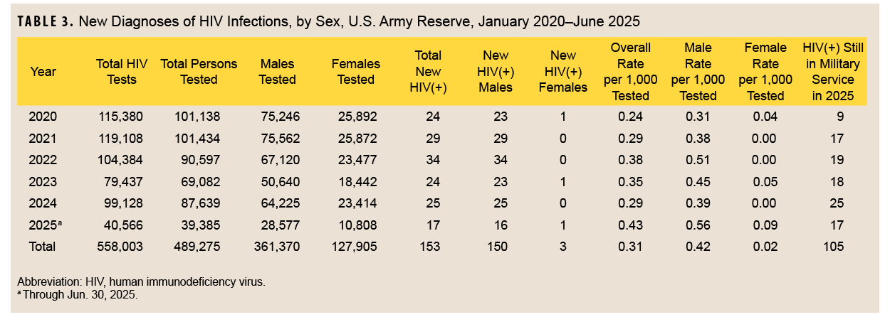 From January 2024 through June 2025, a total of 127,024 U.S. Army Reserve members were tested for HIV antibodies, and 42 were identified as HIV-antibody-positive (seropositivity 0.33 per 1,000 tested) (Table 3). During 2024, on average 1 new HIV infection was detected among Army reservists per 3,965 screening tests. Of the 153 Army reservists diagnosed since 2020 with HIV infection, 105 (68.6%) were still in service in 2025.