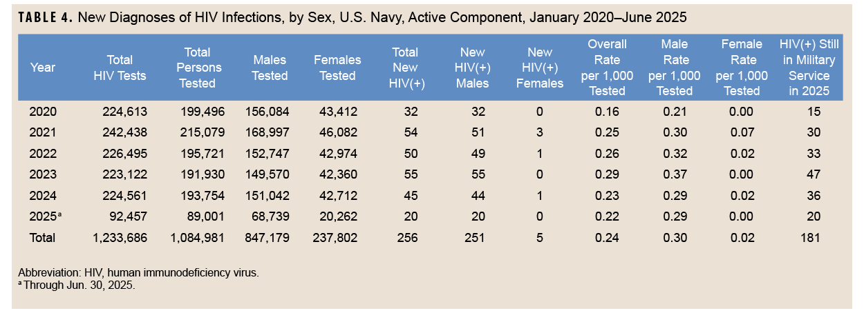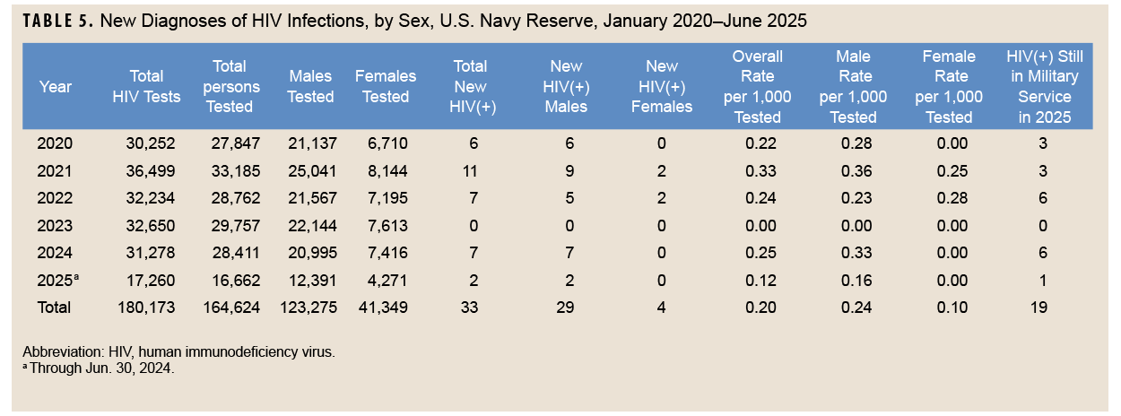 From January 2024 through June 2025, a total of 45,073 members of the U.S. Navy Reserve were tested for HIV antibodies, with 9 sailors identified as HIV-antibody-positive (seropositivity 0.20 per 1,000 tested) (Table 5). On average, 1 new HIV infection was detected in 2024 among Navy reservists per 4,468 screening tests. Of the 33 reserve component sailors diagnosed since 2020 with HIV infection, 19 (57.6%) were still in service in 2025.