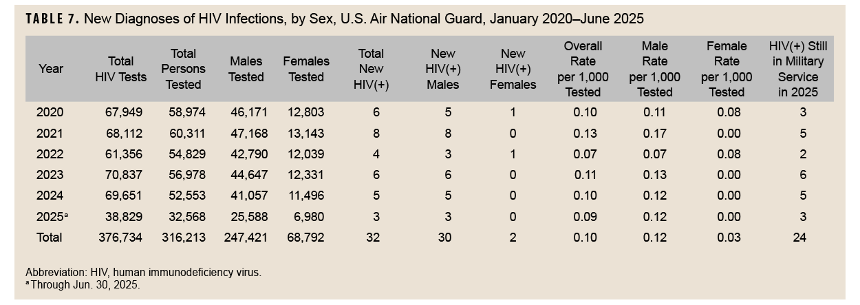 From January 2024 through June 2025, a total of 85,121 members of the Air National Guard were tested for HIV antibodies, and 8 Air National Guard members were diagnosed with HIV infection (seropositivity 0.09 per 1,000 airmen tested) (Table 7). During 2024, on average 1 new HIV infection was detected among Air National Guard members per 13,930 screening tests. Of the 32 Air National Guard members diagnosed since 2020 with HIV infection, 24 (75.0%) were still in service in 2025.