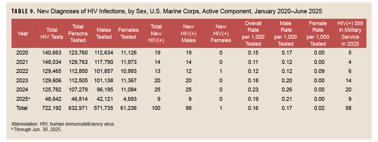 From January 2024 through June 2025, a total of 154,093 active component members of the U.S. Marine Corps were tested for HIV antibodies, and 34 were identified as HIV-antibody-positive (seropositivity 0.22 per 1,000 tested) (Table 9). Annual seropositivity rates rose from a low of 0.11 per 1,000 tested in 2021 to a high of 0.23 per 1,000 tested in 2024 (Table 9, Figure 5). In 2024, on average, 1 new HIV infection per 5,031 screening tests was detected among active component marines. Of the 100 active component marines diagnosed since 2020 with HIV infection, 58 (58.0%) were still in service in 2025.