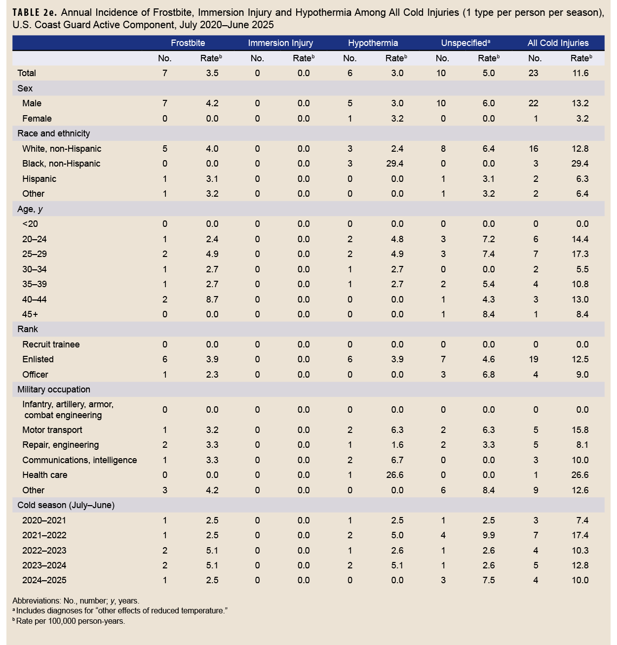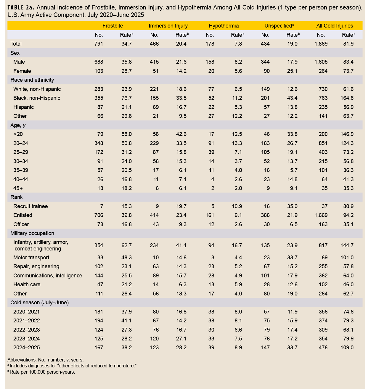 This analysis of cold weather injuries was unable to distinguish between injuries sustained during official military duties (e.g., training or operations) and those associated with unrelated or personal activities. This report expanded the scope of cold injuries beyond specified conditions (e.g., frostbite, immersion injury, hypothermia) to include “other specified and unspecified effects of reduced temperature.” That change contributed to an increased overall case count compared to last year’s report. The increase in cold injury IRs was observed uniformly for all services and specific injury types, suggesting a genuine rise in cold injury incidence rather than solely an artifact of broadened inclusion criteria.