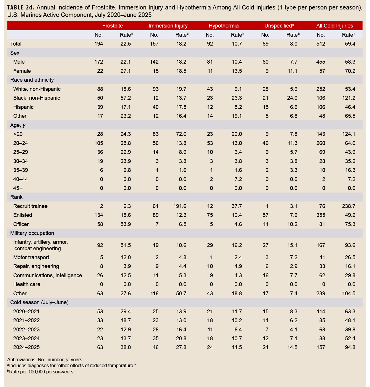 Similar to previous MSMR reports, the highest cold weather injury rates were observed among service members who were male, those in younger age groups, and non-Hispanic Black individuals.8,24 Increasing rates of cold weather injury have also been noted among service members in the United Kingdom (U.K.) military with similar demographic characteristics.21,26,27 Differences in physiological responses to cold stress have been observed between various racial and ethnic groups, with individuals of African descent demonstrating greater vasoconstriction responses compared to individuals of Asian or Caucasian descent.10,15,28 Signs and symptoms of cold weather injury (e.g., skin redness, blotchy skin) may initially be more difficult to see on service members with skin of darker color.29,30 Service members, leadership, and medical personnel should be educated on the early signs and symptoms of cold weather injuries for a wide range of skin types.