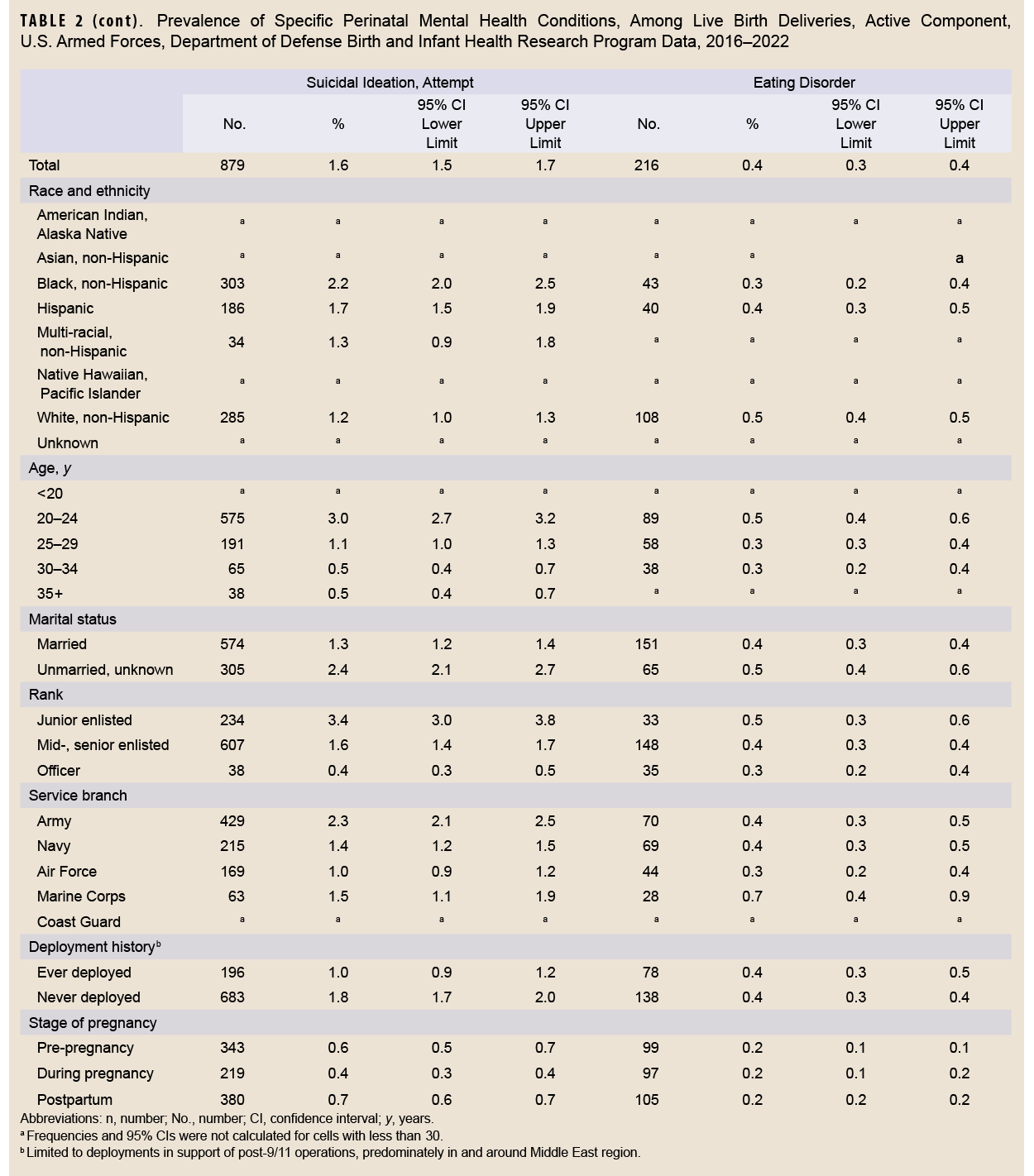Recent research suggests that deaths from suicide or accidental overdose account for a much larger percentage of pregnancy-associated deaths among ADSW (39.4%) compared to civilian women (8.8–10.9%).4 The increased burden of mental health conditions among ADSW continues after military service, with as many as 46.7% of female veterans reporting perinatal depression, compared to 10% of civilian women.5 Existing research only provides the prevalence of any mental health condition versus specific diagnoses, without estimates for sub-populations of ADSW. This report describes the 2016–2022 prevalence of perinatal mental health conditions among ADSW, with data presented for 5 diagnostic categories: trauma and stressor-related disorders, anxiety and panic disorders, depressive disorders, suicidal ideation or attempt, and eating disorders.